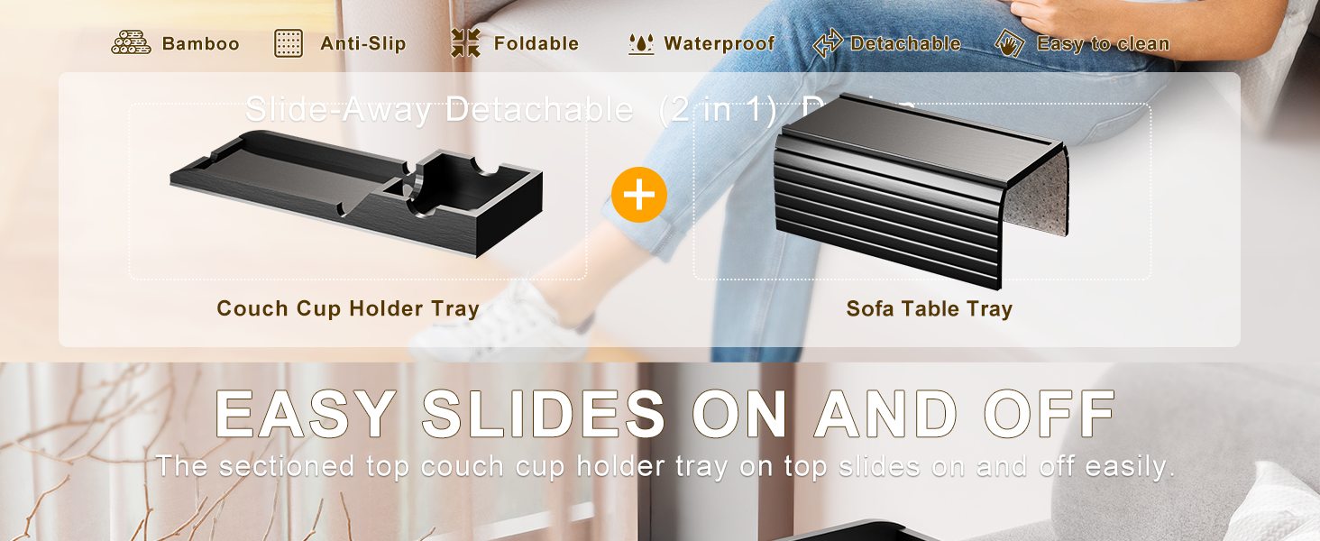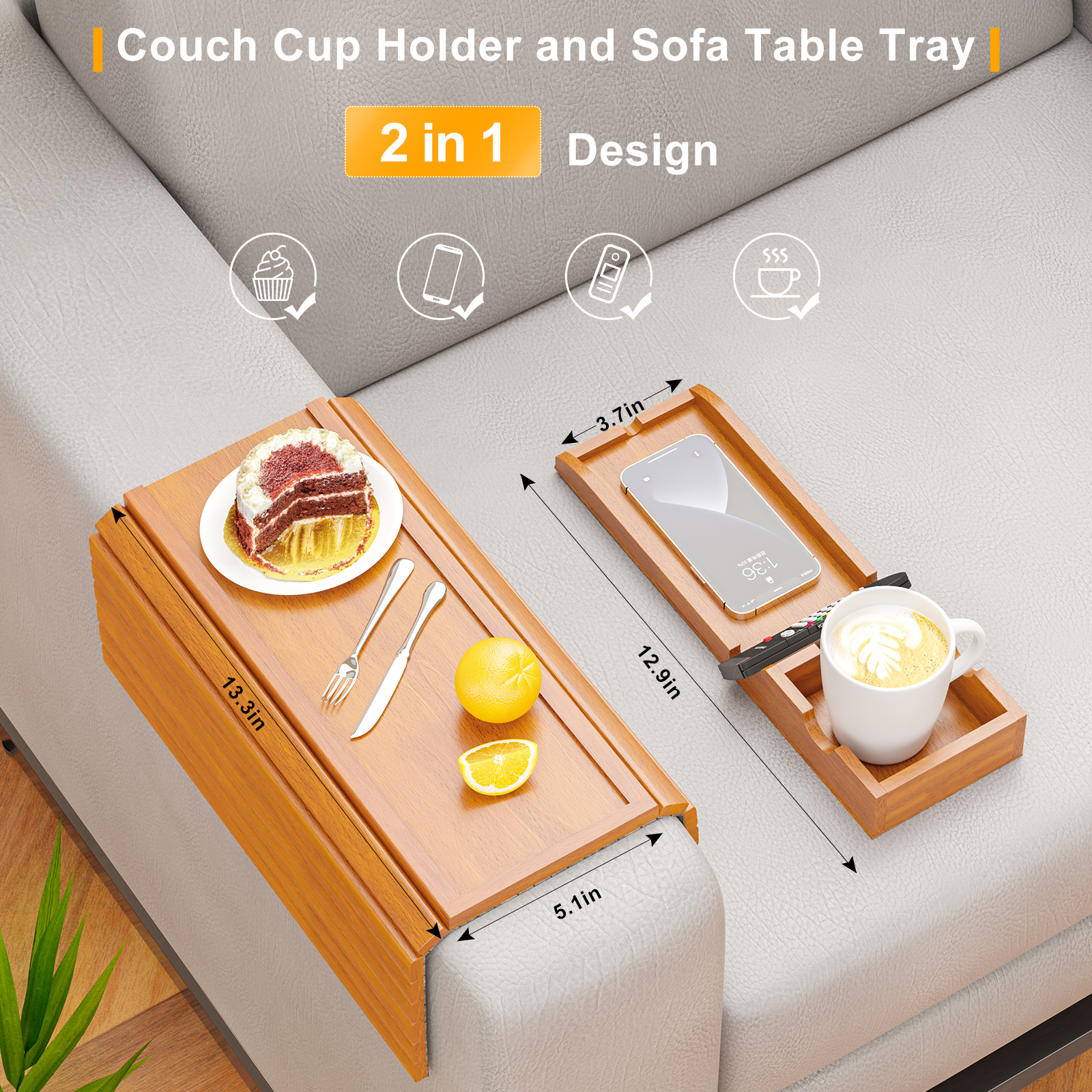 - ✅【Slide-Away Detachable 2 in 1 Design】Sofa Tray Table and Couch Cup Holder Tray 2 in 1 design for drink and telephone, remote control. After detachan the sofa clip on side table can also be used as a computer tray table, coffee cup tray, placemat, and food tray.