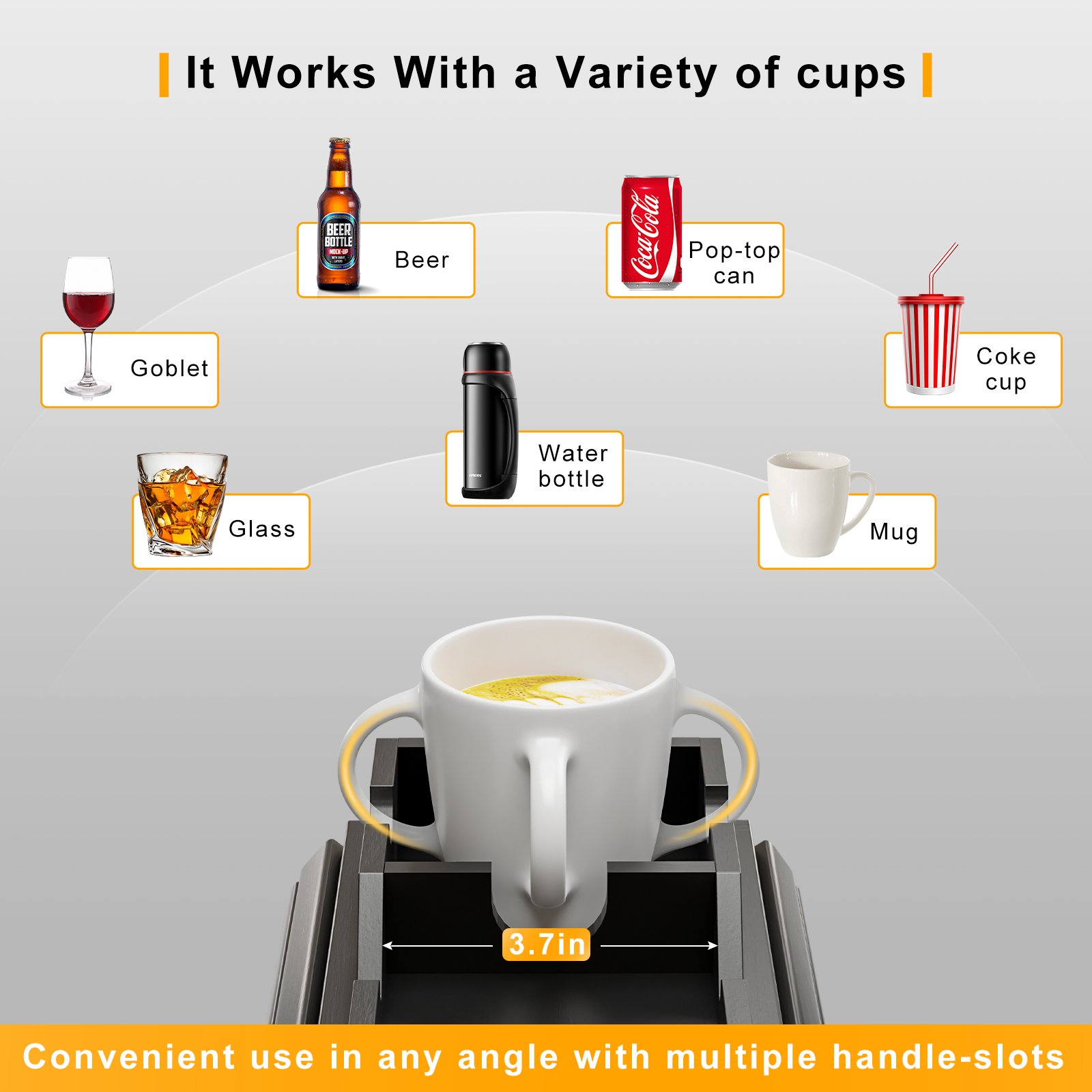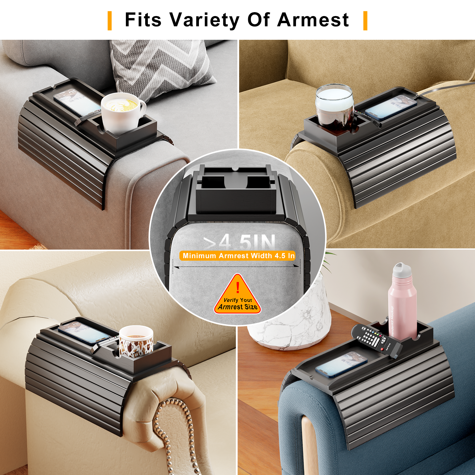 - ✅【Couch Arm Tray with Anti-Slip】Ideal replacement for coffee tables, easy to use, easy to assemble. The non-slip pad at the back of the cup holder for the couch not only sticks it tightly to the armrest of the sofa to keep it stable, prevent the drink from spilling and soiling the sofa, but also protect the sofa from injury.